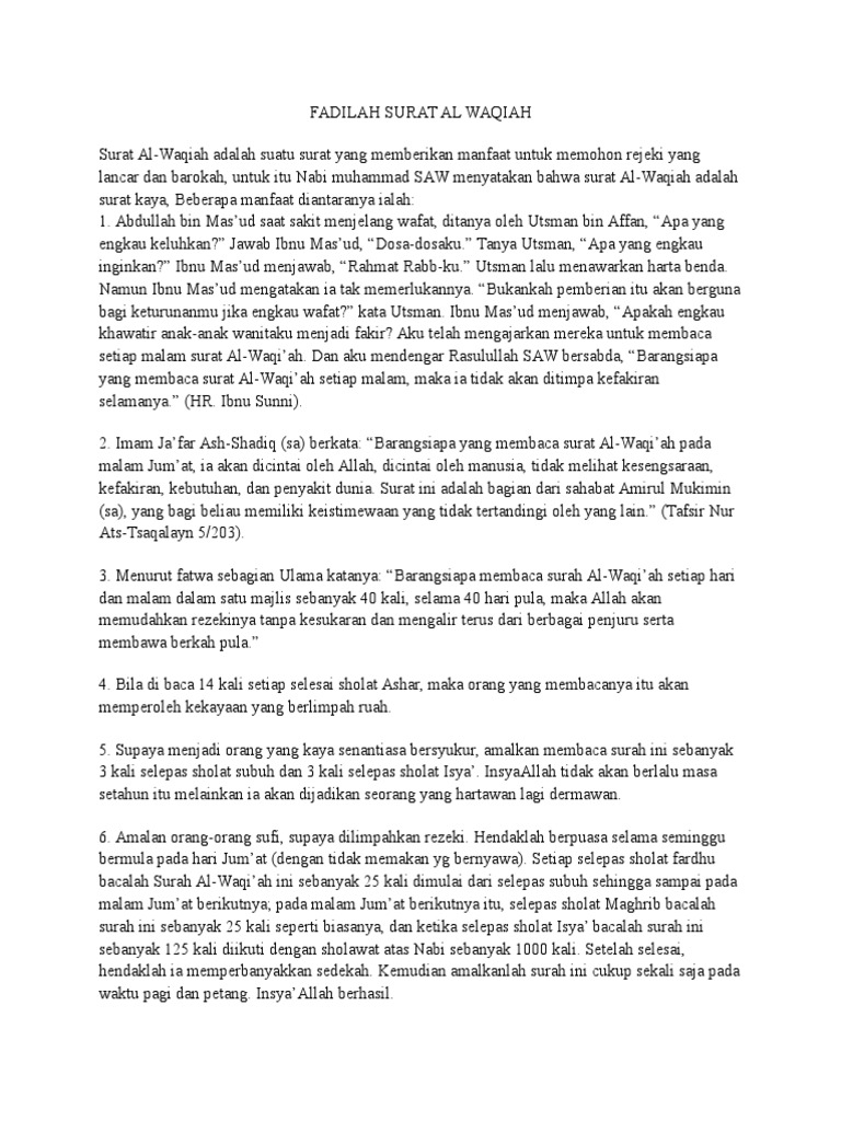 Surat al waqiah (سورة الواقعة) adalah salah satu surat yang penuh dengan fadhilah dan keberkahan. Dikutip dari buku 'kedahsyatan membaca al qur'an' karya amirulloh syarbini & sumantri jamhari, maksud dari hadits tersebut adalah surat al waqiah. Banyak manfaat yang akan kita peroleh apabila rajin membaca surat surat al waqiah tersebut. Sahabat fillah biasakan menonton sampai selesai. Imam ja'far ash shadiq sa berkata itulah pembahasan singkat kami mengenai fadhilah, keistimewaan, khasiat dan manfaat membaca surah al waqiah untuk banyak rezeki dan kekayaan melimpah. Padahal jika kita membacanya dengan niat untuk mendapatkan kekayaan hati dan akhirat semata, dengan sendirinya dunia akan mendatangi kita. Berpuasa selama seminggu dimulai pada hari jumat. Surat al waqiah bisa diamalkan setelah solat ashar ataupun sholat subuh, dimana jika rutin mengamalkannya akan mampu membuka aura kerezekian, dilancarkan rezekinya dan dilimpahkan oleh yang maha kuasa. Dalam hadits sahih, nabi muhammad saw pernah bersabda mengenai keutamaan surat al waqiah. Sahabat fillah semangat yah untuk selalu istiqomah membaca surat al waqiah. Surat al waqiah adalah surat dalam al quran dimana surat ini terdiri dari 96 ayat penuh makna. Keberkahannya mampu melenyapkan kemiskinan dan mendatangkan rejeki bagi siapa saja yang membacanya dengan rutin. Dengan membaca surat al waqiah diharapkan banyak faedah yang didapatkan.