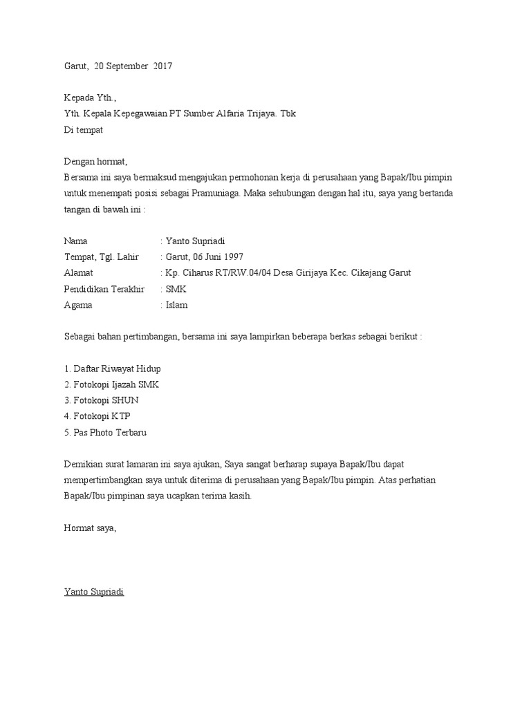 Berkas yang dapat anda sertakan yaitu seperti cv, pas foto, fotocopy ijazah. Dengan hormat, berdasarkan informasi yang saya peroleh dari situs resmi alfamart. Hal ini bertujuan agar surat lamaran anda. Berikut ini cara membuat surat lamaran pekerjaan yang bisa kamu buat sebahagai referensi sehingga bisa menmenjadikan surat lamaran kerja anda bagus dan menarik contoh surat lamaran pekerjaan di alfamart. Surat lamaran merupakan surat permohonan yang dibuat oleh para pelamar pekerjaan atau pencari kerja, kemudian dikirimkan terhadap suatu badan usaha maupun instansi untuk mendapat pekerjaan maupun jabatan berdasarkan lowongan pekerjaan ditawarkan.