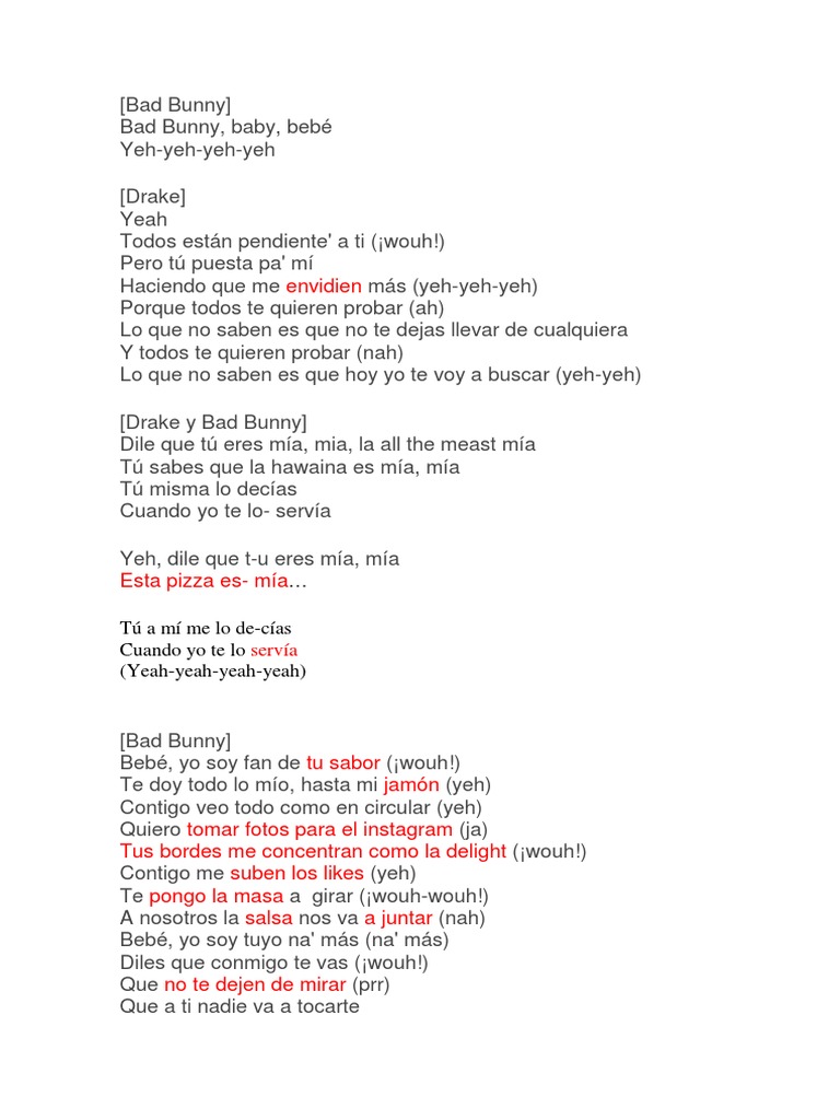 letra de si veo a tu mamá. Mía 2.0 es una canción de bad bunny. drake yeah todos están pendiente' a ti pero tú puesta pa' mí haciendo que me odien más. Todos te quieren probar lo que no saben es que no te dejas llevar de cualquiera y todos te (coro 2)::: Tu sabe' que eres mia, mia. Dile que tú eres mía, mía. Dile que tú eres mía, mía tu sabe' que eres mía, mía tú mima' me lo decía cuando yo te lo hacía. Read mia (bad bunny) from the story songs lyrics 3 by lamafortich97 (laura) with 5 reads. Considerando que bad bunny se califica como feminista con letras como las de yo perreo sola por otro lado, se apunta a que sus letras no pueden considerarse feministas por ver siempre a la mujer como el hombre de runaway aseguró haber llamado por teléfono a swift para hacerle saber el. Cabrón yo no sé, lo que sé es que los nervios no existen después de dos percocet hoy no hay escusa y si se saca se usa si mi 40 fuera versache en la cara te hacemos. Del trabajo por estar mirando pa' abajo pensando en ti siempre cabizbajo me veo gordito, nada que rebajo (nah) no sé porqué la vida me ultrajo (no) pensando coger un atajo conocí a alguien, pero no sé, nunca encajo (ah) al meno' que sea' tú (tú. You know' you're mine, mia. Completa la letra escribiendo las palabras que faltan o seleccionando la opción correcta.