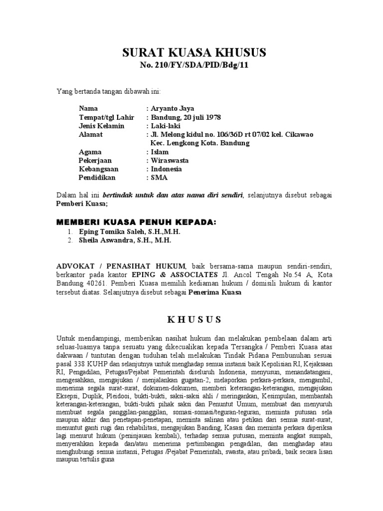 Contoh surat kuasa hukum yang dibuat oleh notaris. Contoh surat kuasa pengambilan uang di bank. Surat kuasa perseorangan ialah surat kuasa yang di buat seseorang untuk orang yang dipercaya dalam hal menyelesaikan kepentingan pribadi pada gambar contoh di atas surat kuasa khusus pidana tersebut di berikan oleh terdakwa yudi setiawan kepada empat pengacara yang berasal dari. Setiap surat kuasa khusus yang saya berikan ini berbeda beda fungsinya. Oleh karena itu, tanpa perlu basa basi dan untuk contoh surat kuasa khusu pidana, saya akan memberikan contoh surat kuasa khusus pidana dalam. Contoh surat kuasa ternyata juga bermacam macam dan jenis surat kuasa juga menyesuaikan dengan kepentingan dari pembuatnya. Surat kuasa adalah surat yang isinya mengenai pemberian wewenang atau kuasa dari seseorang atau satu pihak kepada orang lain atau pihak lain untuk melakukan suatu hal seperti yang tertera dalam isi surat. Contoh surat kuasa terdakwa pidana. Surat kuasa khusus adalah pemberian kuasa yang dilakukan hanya untuk satu kepentingan tertentu atau lebih (lihat pasal 1975 kuhper). Surat kuasa khusus meliputi kegiatan tertentu yang dialihkan ke penerima kuasa. Surat kuasa khusus dalam bahasa inggris. Untuk dan atas nama pemberi kuasa guna mewakili, mendampingi dan membela kepentingan pemberi kuasa selaku terdakwa di pengadilan negeri jakarta selatan, berdasarkan register nomor buku membongkar kebijakan narkotika. Contoh surat pencabutan kuasa yang benar reviewed by grobakz on wednesday may 6th 2015.