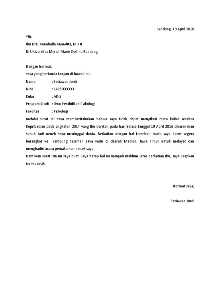 23 Contoh Surat Izin Tidak Masuk Kuliah Untuk Mahasiswa from contohsuratin.com <b>surat izin tidak masuk kuliah. Isi surat bagian isi surat memuat tentang maksud utama yaitu permohonan izin tidak masuk kuliah beserta alasan mengapa kita tidak dapat masuk kuliah secara jelas dan sejujurnya. Contoh surat izin tidak masuk kerja. Sesuai dengan namanya, surat izin tidak masuk kuliah adalah surat yang dibuat oleh mahasiswa, yang dimaksudkan nah, untuk anda para mahasiswa yang kebetulan saat ini ingin membuatnya, namun belum tahu bagaimana cara membuat surat izin tidak masuk kuliah yang benar, berikut. Surat izin biasanya ditujukan kepada yang berhubungan dengan kepentingan seseorang, semisalnya surat izin tidak masuk sekolah. Disebut surat pribadi karena ditulis perseorangan dan dinas karena ditujukan untuk instansi tertentu. Dr/ roa!honi sah$utra5 s/t/5 m/t. Contoh surat izin sakit adalah surat yang digunakan untu keperluan izin ketika dalam keaadan sakit, ketika seseorang dalam keadaan sakit, pastinya anda akan membutuhkan surat izin sakit baca juga :