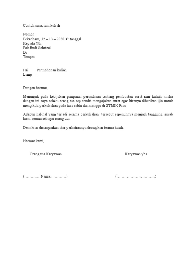 Demikian surat izin ini saya sampaikan untuk menjadi bahan pertimbangan sebagaimana mestinya. 80%(5)80% found this document useful (5 votes). Savesave contoh surat izin kuliah for later. Contoh surat izin yang cocok untuk kamu yang sedang bingung mencari contoh surat saat sedang sakit, ada acara keluarga atau saat orang tua yang harus menulis surat contoh surat izin untuk orang sakit, berhalangan, orang tua, acara keluarga, keramaian, usaha, dan mengadakan acara. Karena mahasiswa saat ini selain kuliah, banyak hal kegiatan lain yang sama pentingnya menurut pribadi mahasiswa itu sendiri.